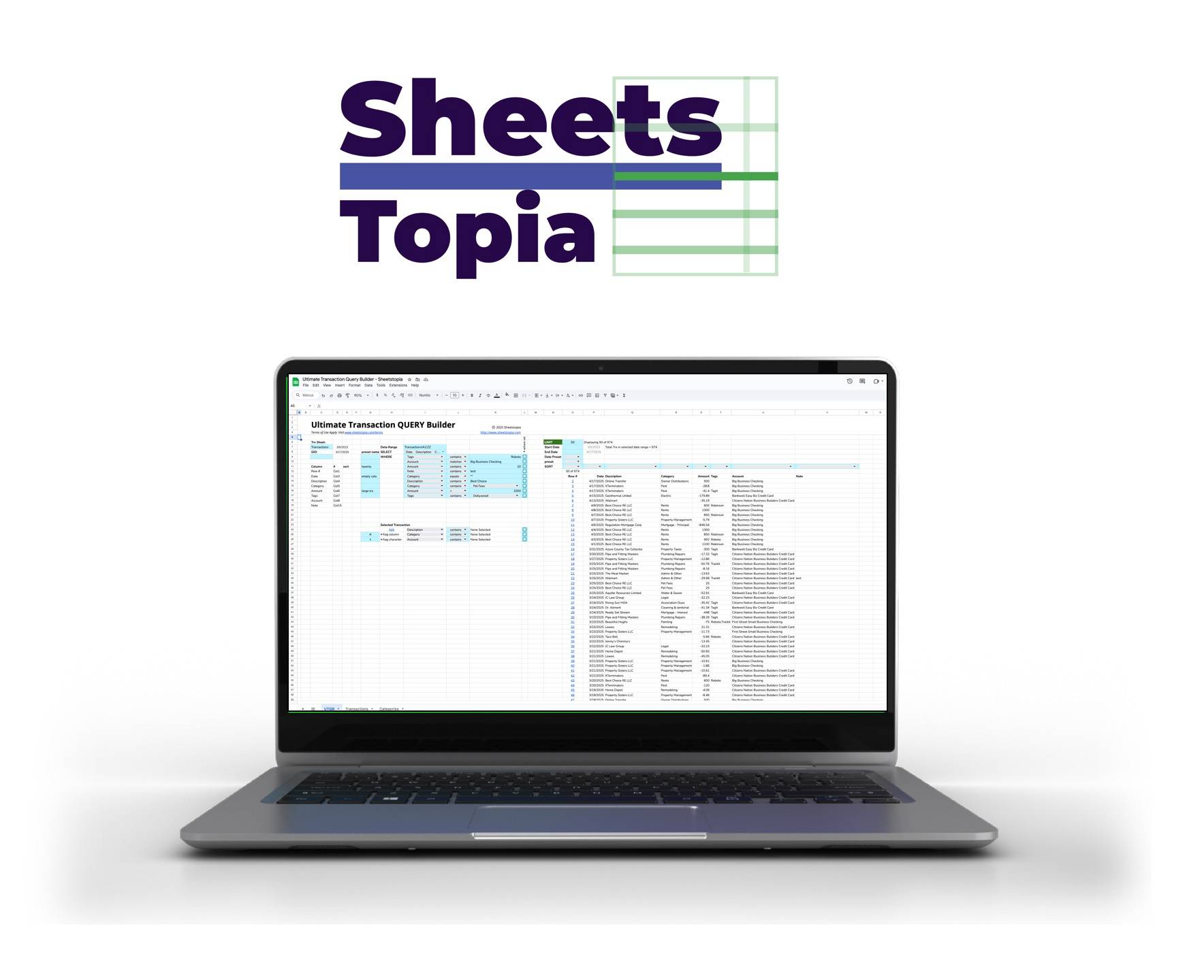 With this template for Google Sheets, you'll quickly create completely customized transaction queries in an intuitive manner, following the basic building blocks of the Google Sheets QUERY function!